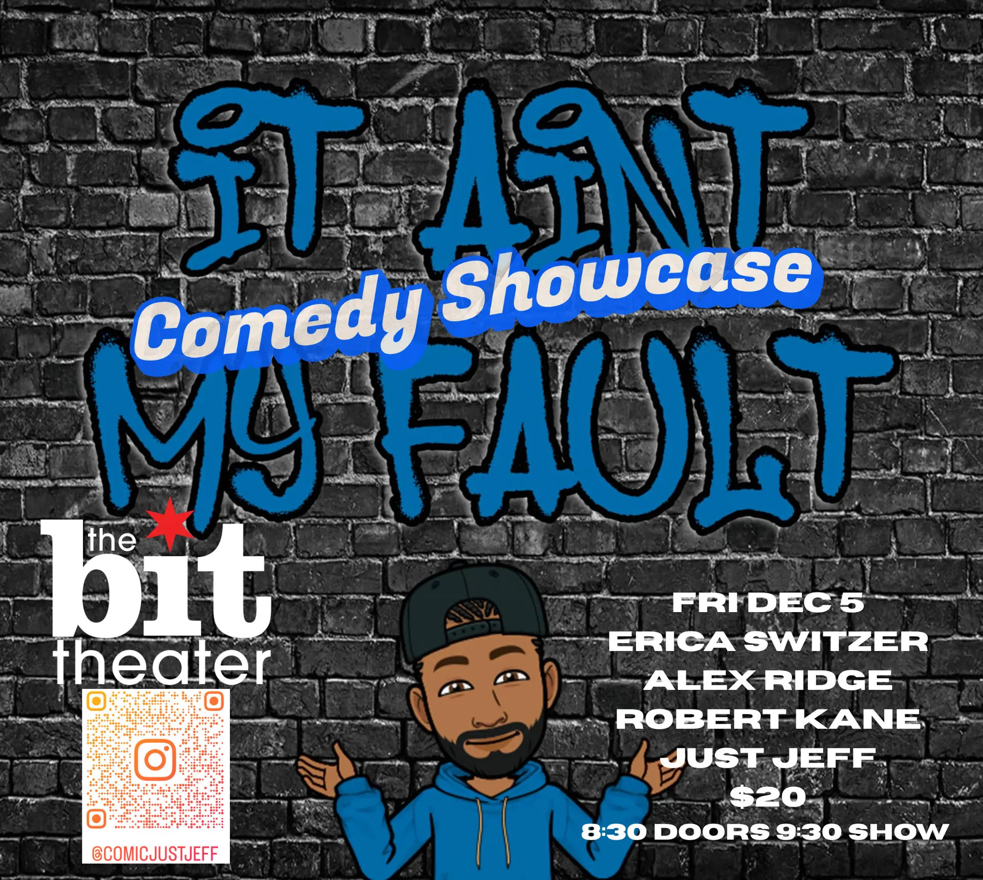 Get ready for an unforgettable night of bold, brilliant, and unfiltered comedy as Just Jeff and Erica Switzer present "It Ain’t My Fault", a powerhouse lineup of stand-up talent that brings fresh voices and sharp perspectives to the stage.Â