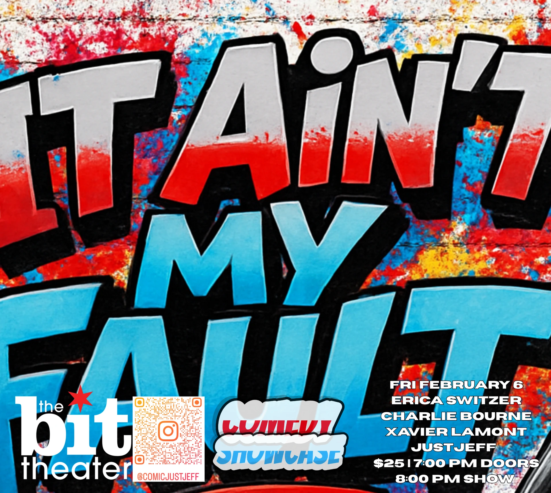 Get ready for an unforgettable night of bold, brilliant, and unfiltered comedy as Just Jeff and Erica Switzer present "It Ain’t My Fault", a powerhouse lineup of stand-up talent that brings fresh voices and sharp perspectives to the stage.